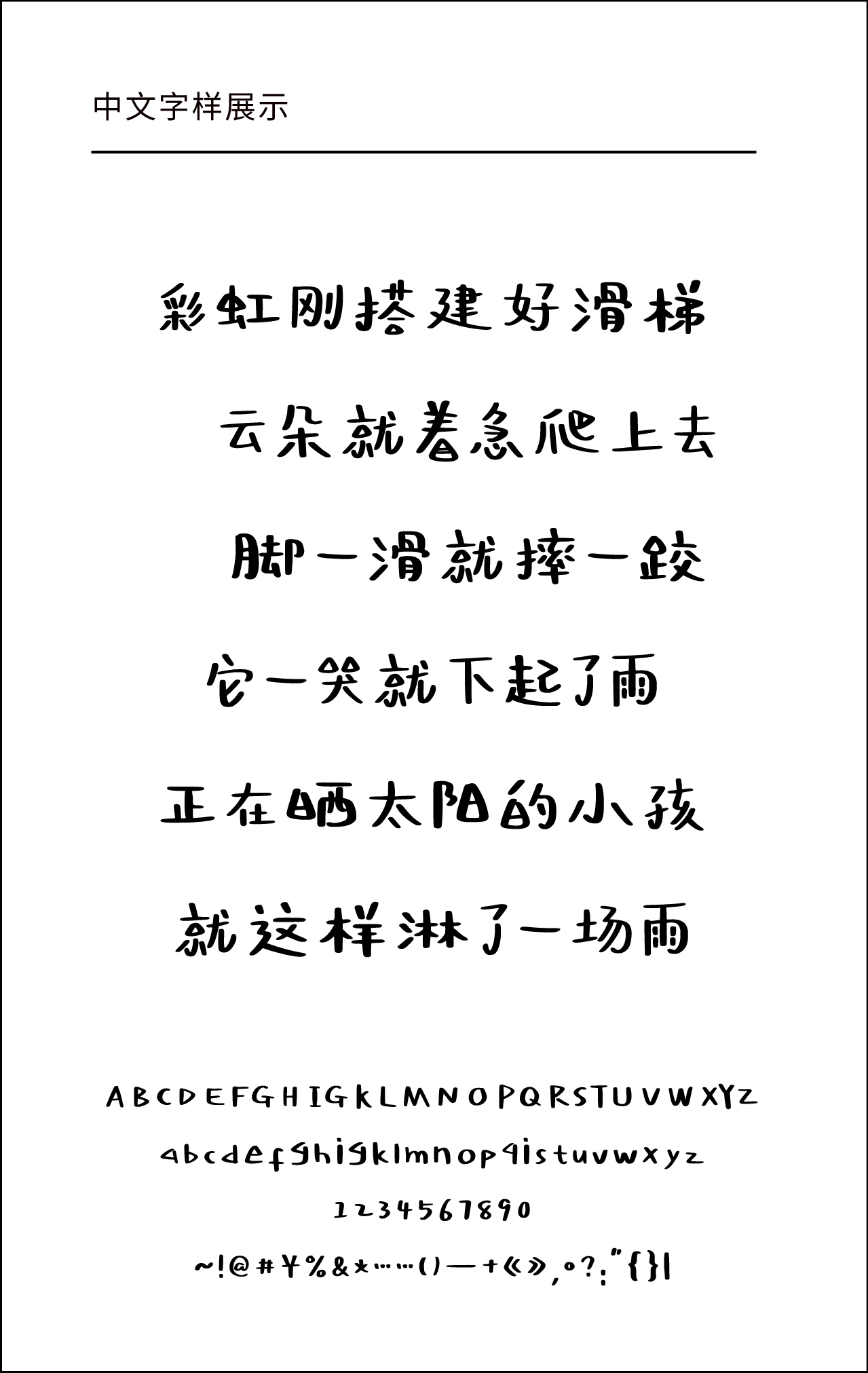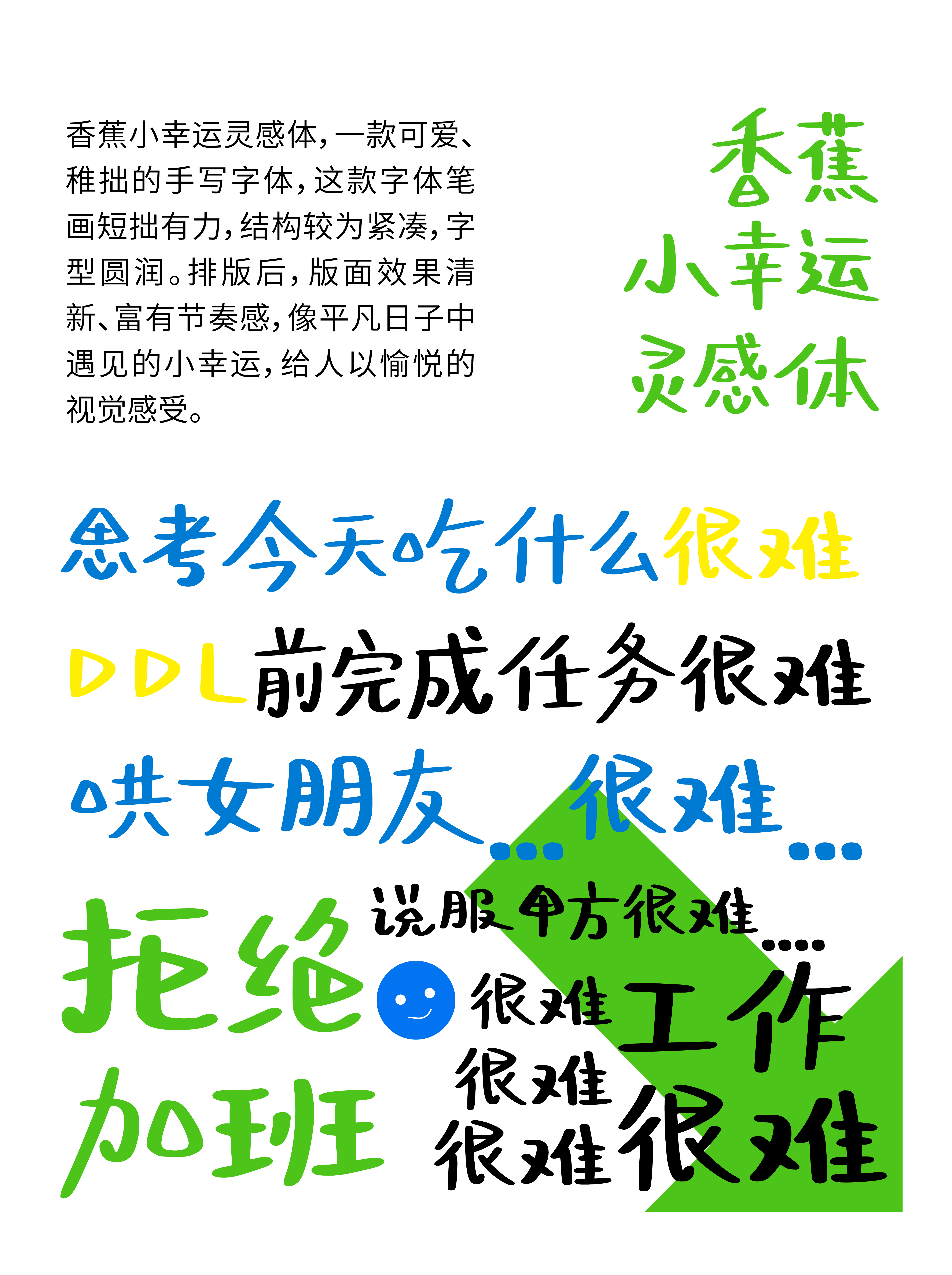 香蕉小幸运灵感体,一款可爱、稚拙的手写字体,这款字体笔画短拙有力,结构较为紧凑,字型圆润。排版后,版面效果清新、富有节奏感,像平凡日子中遇见的小幸运,给人以愉悦的视觉感受。